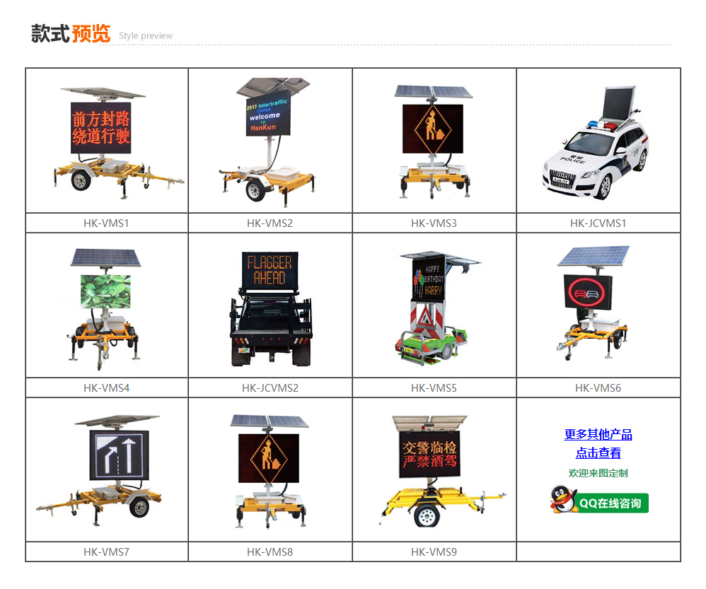 移動牽引式車載LED顯示屏,國際上簡稱:VMS,交通信息情報板(屏),是廣告?zhèn)髅絃ED的延伸,多用于戶外信息公告、形象廣告、活動廣告、信息媒介、商業(yè)促銷活動,政府、社會團體、機關(guān)、學校舉辦各類宣傳活動、道路交通指引可變情報顯示等;而我們加以太陽能板光伏,其實效性、靈活性、便利性等特點,應用更加廣泛。
